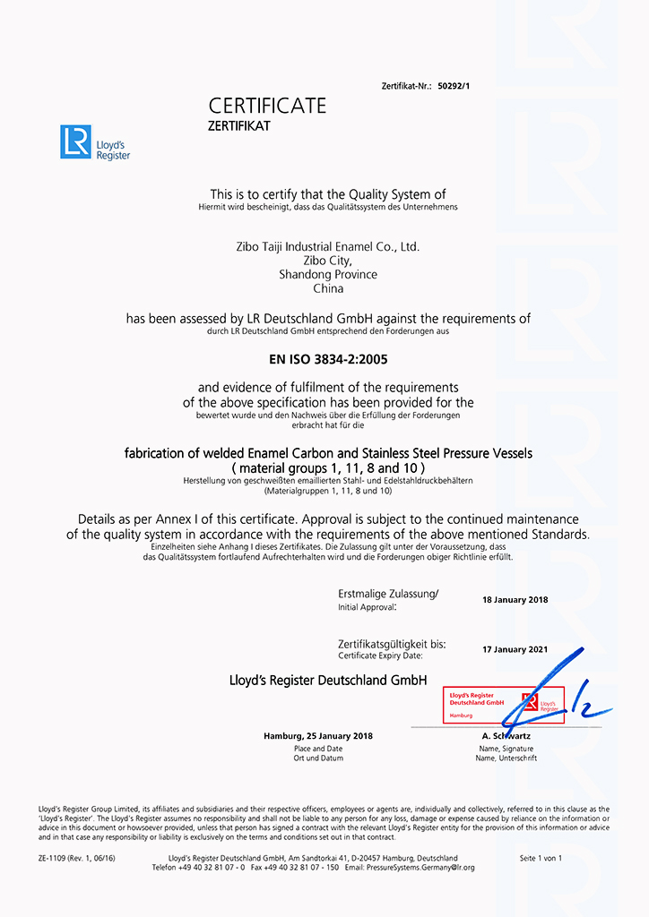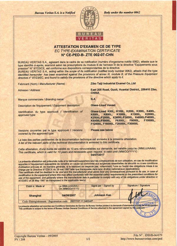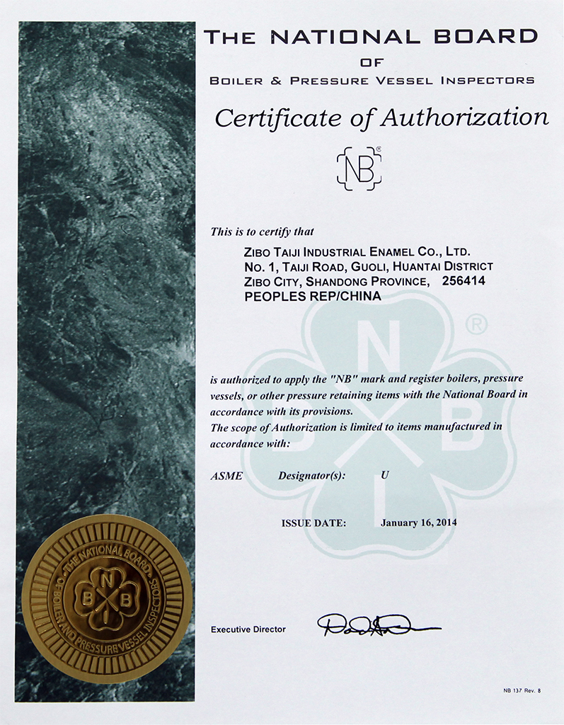 淄博太極在中國搪玻璃設(shè)備制造行業(yè)中首家通過ISO90001質(zhì)量體系認(rèn)證,并擁有美國ASME認(rèn)證、歐洲PED認(rèn)證以及國家部門頒發(fā)的搪玻璃制造許可證、進(jìn)出口許可證和百余項(xiàng)榮譽(yù)證以及三十六項(xiàng)專利等。